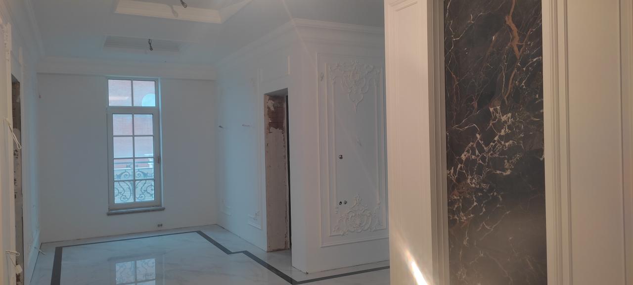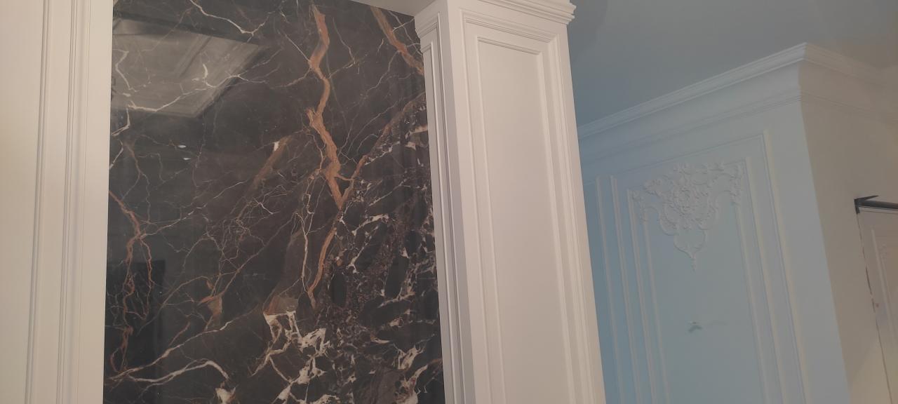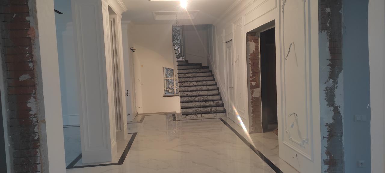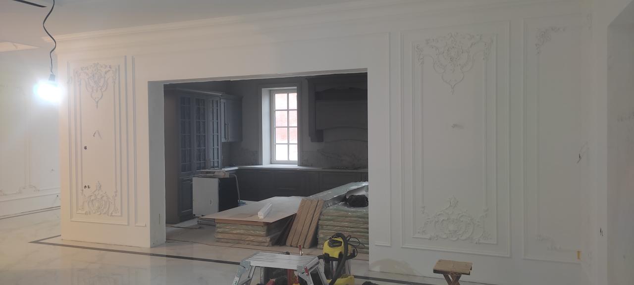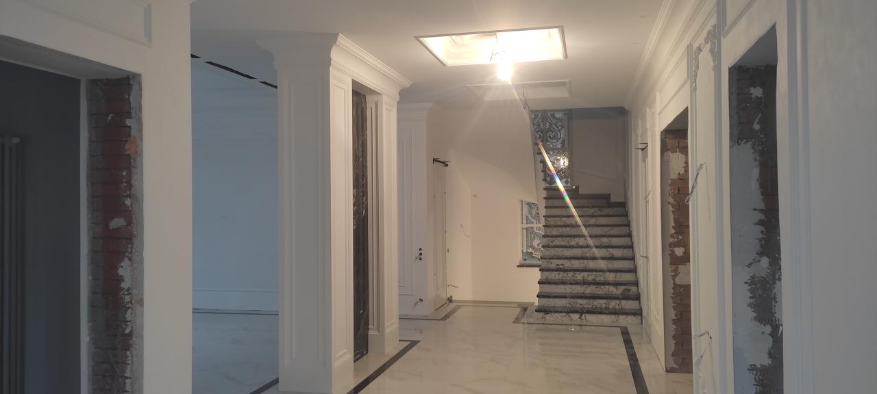 23 апреля 2023 Краска derufa 7, акриловый лак derufa effect matt Обои Малярный флизелин Галтели Orac, гипсовая лепнина Молдинги Orac, художественные элементы из полиуретанаХолл 1 -го этажа, выполненный в одном стиле с лестничным маршем и дизайном верхнего холла.
