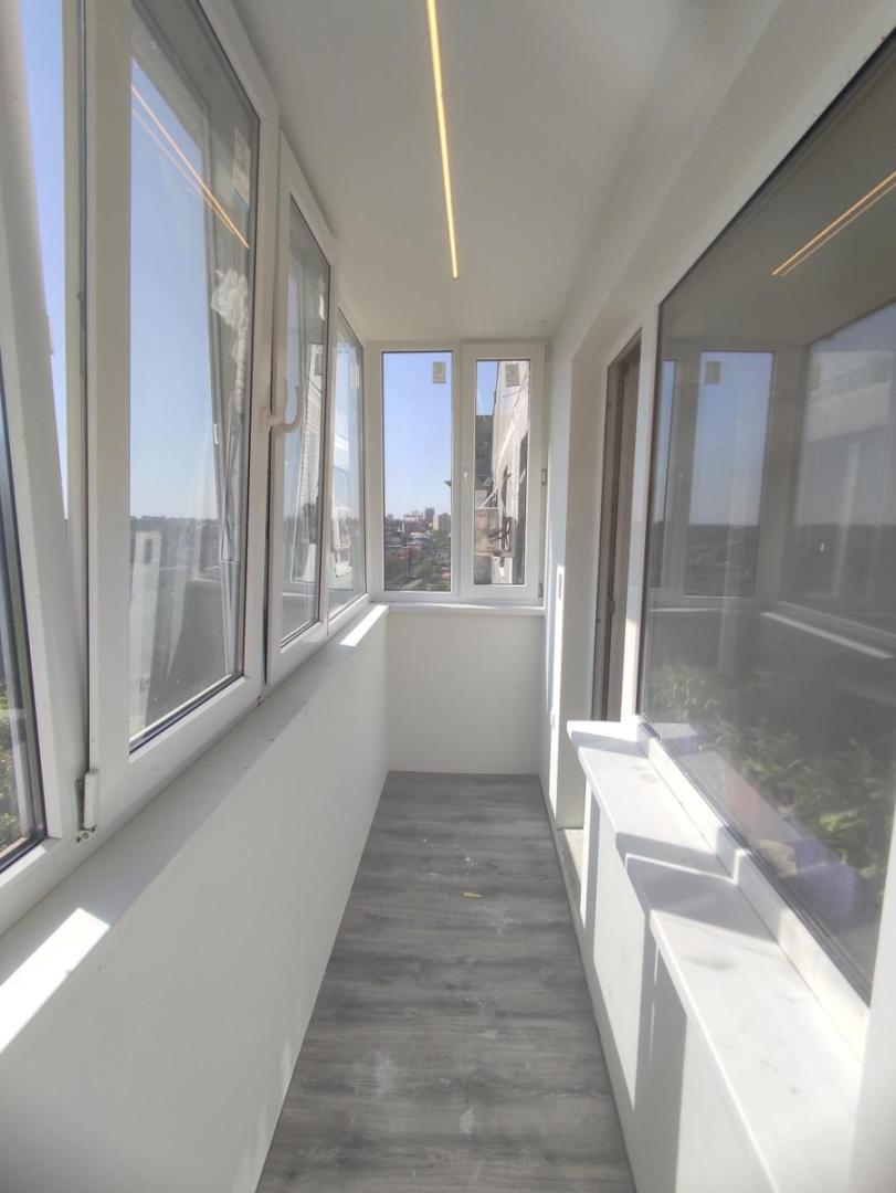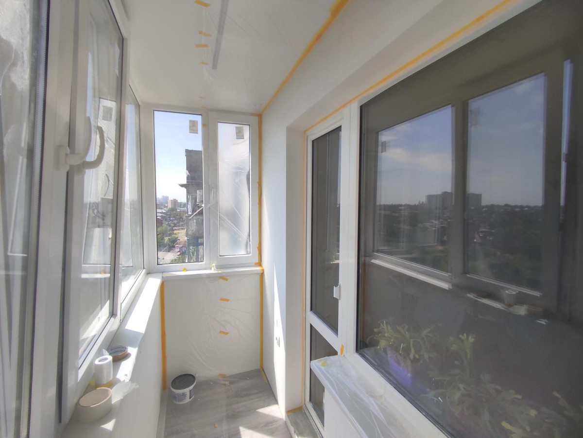 Внутренние стены балкона оштукатурены сухой цементной смесью, подготовлены под малярный флизелин фасадной шпатлевкой и оклеяны малярным флизелином.