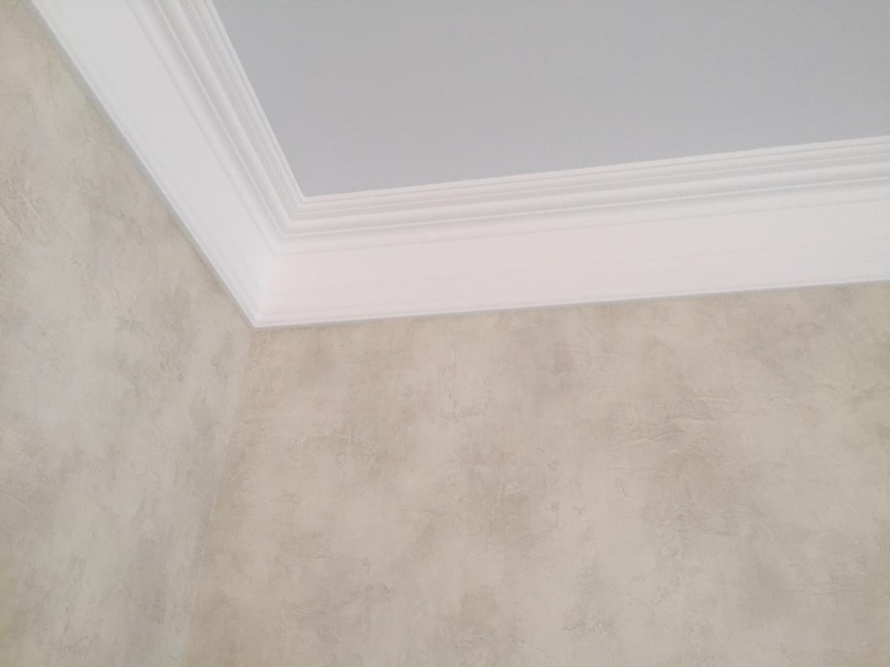 Под натяжной потолок установлен карниз, подготовлен под покраску и покрашен.
