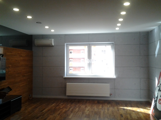 Квартира интересна использованием ламината на стенах и печатных обоев под бетон, которые отдельно заказывали в типографии.