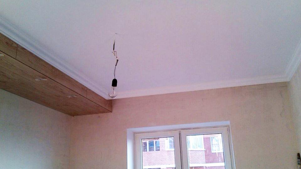 Потолки были оштукатурены по маякам, для исправления геометрии углов была произведена оттяжка вертикальных углов и углов примыканий стен с потолком и полом.